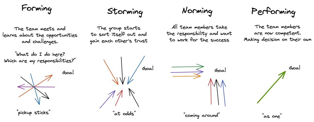 1. I share this diagram with other leaders a lot. It shows that a team goes in different phases and so your leadership style should do. It's a common mistake to give autonomy to a team that needs direction. I explain the leadership style depending on the team state Thread 🧵👇