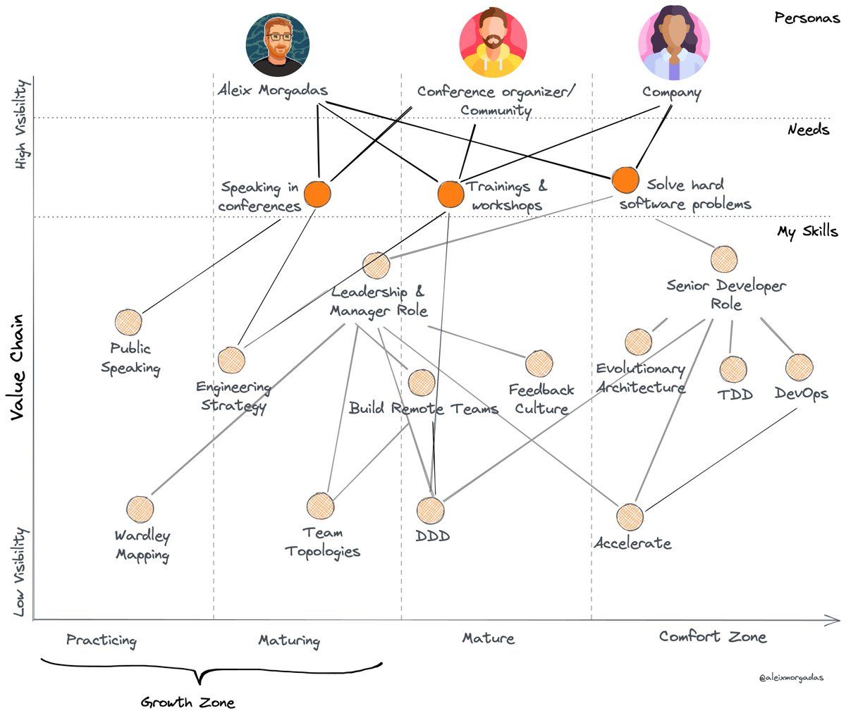 Me attending #MapCamp today: - Aleix's brain: Is it possible to #WardleyMapping a personal value proposition? - Aleix: Hold my beer 🍺 There you go. aleixmorgadas.dev mapped🗺️😄 And you? Which is your personal value proposition map? #PersonalWardleyMap